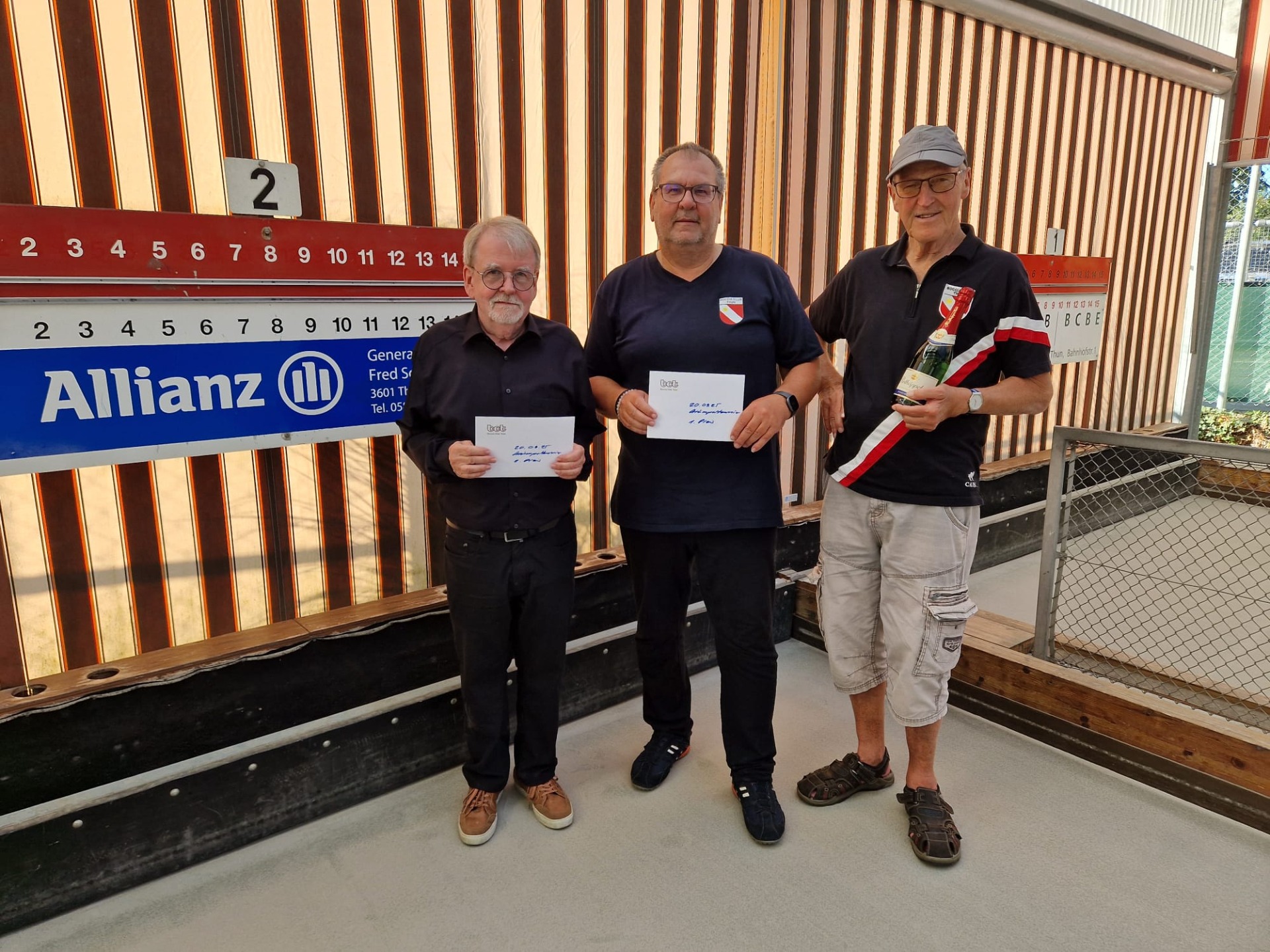 Das Bersaglio zwischen Pallino und der orangen Kugel lag kurz vor der hintersten blauen Linie. Chrigu schaffte es seine blaue Kugel zwischen Pallino und der orangen Kugel durch zu schiessen (Raffa). Pole fragte, ob er es nochmals schaffe. Chrigu sagte, zahlst du mir ein Bier, wenn ich es schaffe, die Antwort war natürlich ja. Es ist kaum zu glauben aber Pole musst das Bier ausgeben.